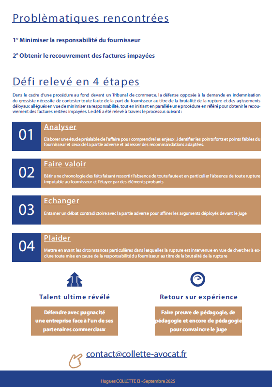 Le cas échéant, le Cabinet COLLETTE AVOCAT assurera la défense de votre entreprise au mieux de ses intérêts, à travers les offres dédiées :